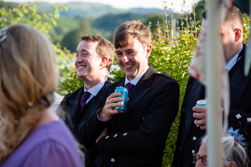 “Glenn and the groomsmen went for kilts, even though none of them are Scottish. Glenn wanted to wear a kilt because of where the wedding was being held. Glenn had wanted to wear a Northumbrian tartan but Zoe vetoed that idea because she thought it looked grey from a distance. We chose a Western Isles tartan because it matched the colour scheme and Glenn’s family names didn’t have any tartans! During the wedding, Glenn appreciated how practical and comfortable the kilt is, repurposing the sporran as a drink’s holder.”