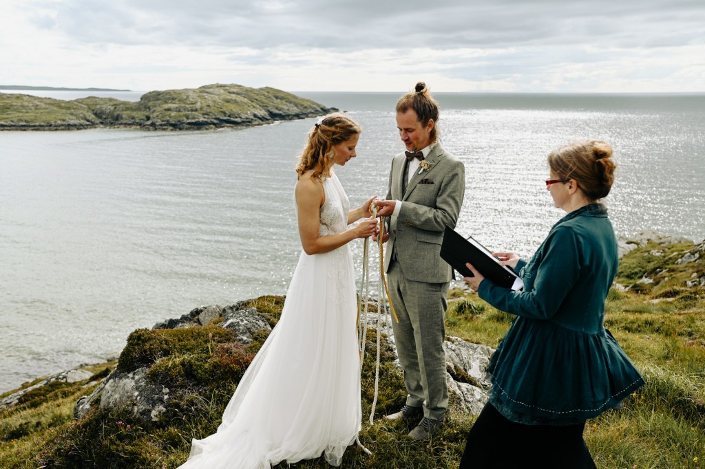 Monika is a warm, open-hearted celebrant based in Achmelvich, and one of the only in the Highlands who can fluently speak German, which meant she could hold the ceremony entirely in the couple’s native language. Although I couldn’t understand every word, the emotion was crystal clear. I watched as they exchanged personal vows, standing the cliffs, the wind in their hair, the sea crashing below at the beach. It was breath-taking.