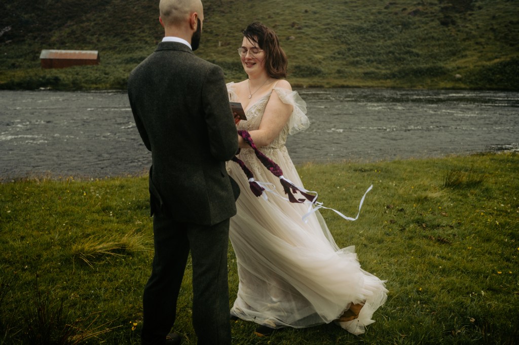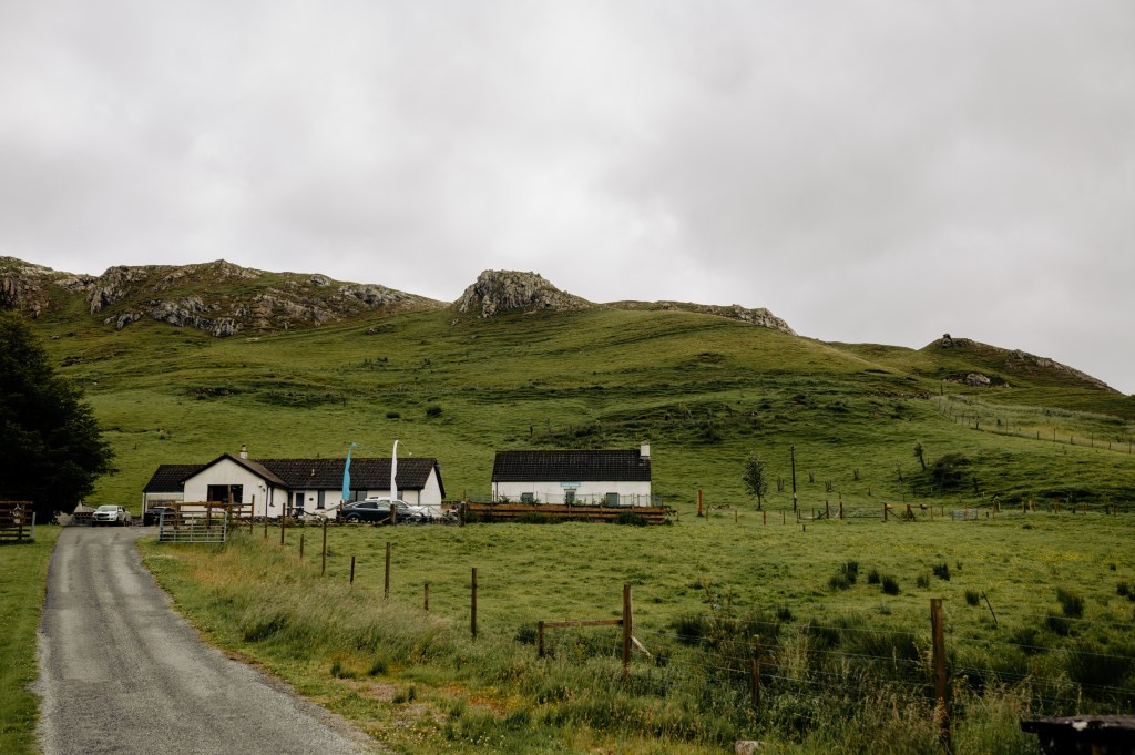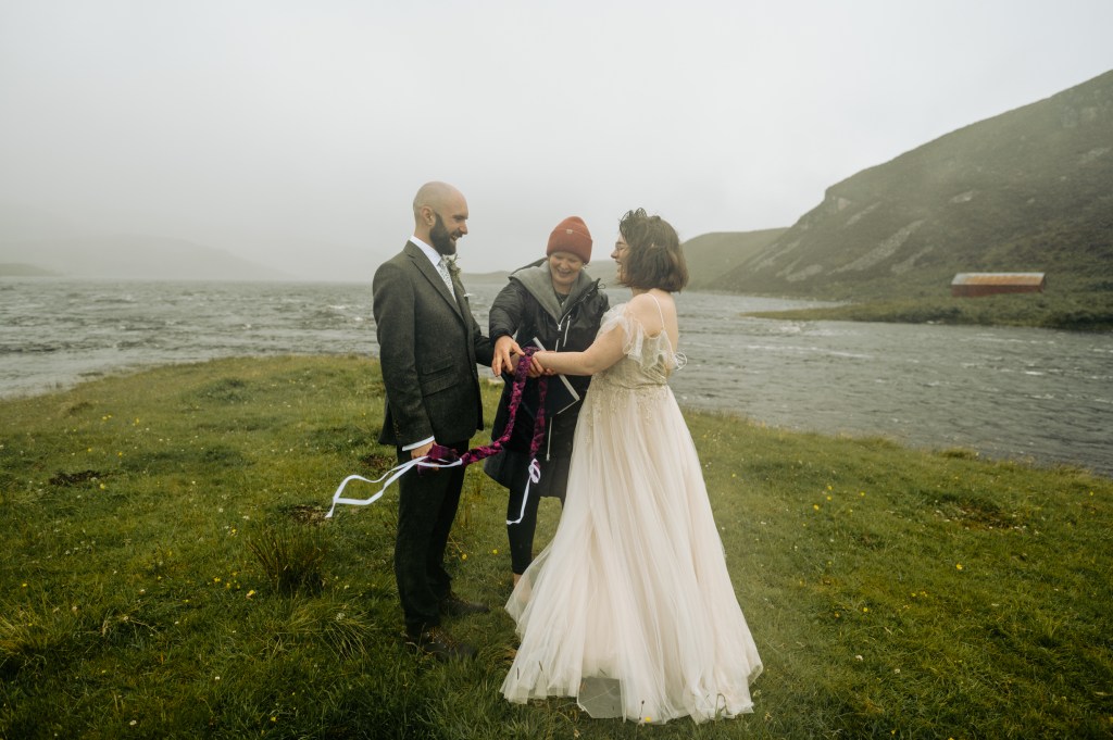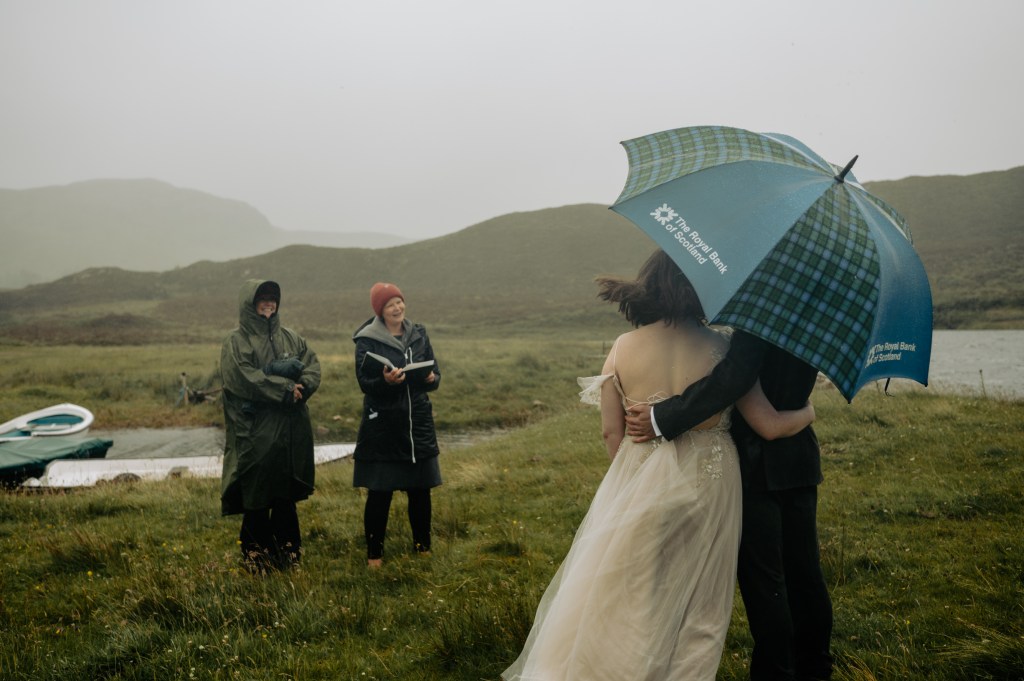 Meg and Sam chose to honour ancient Scottish traditions with a handfasting, their hands bound with tweed that Sams Mum has given them, this was a lovely touch, as they spoke their vows, rain falling softly between every word. They drank from the quaich, the cup of love and unity, sealing their promises with the old Scottish ways. It was raw, and real, and utterly beautiful. They also wrote personal vows which is such a stunning thing to do for each other. Just as Sam was about to read his, which were written on an Ullapool postcard, the wind picked up and nearly blew them away. With quick cat-like reflexes, Sam caught his vows, thankfully – phew!