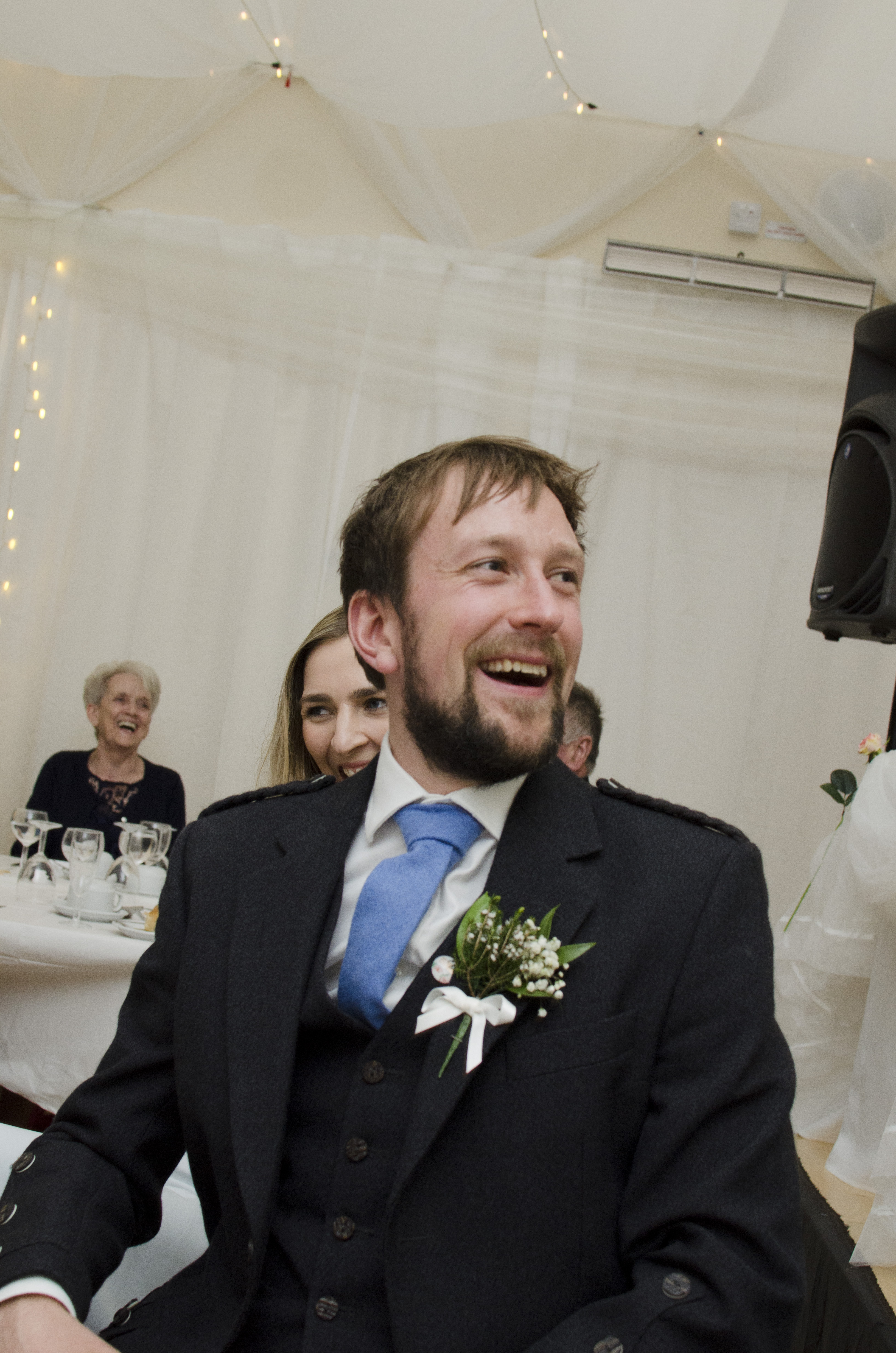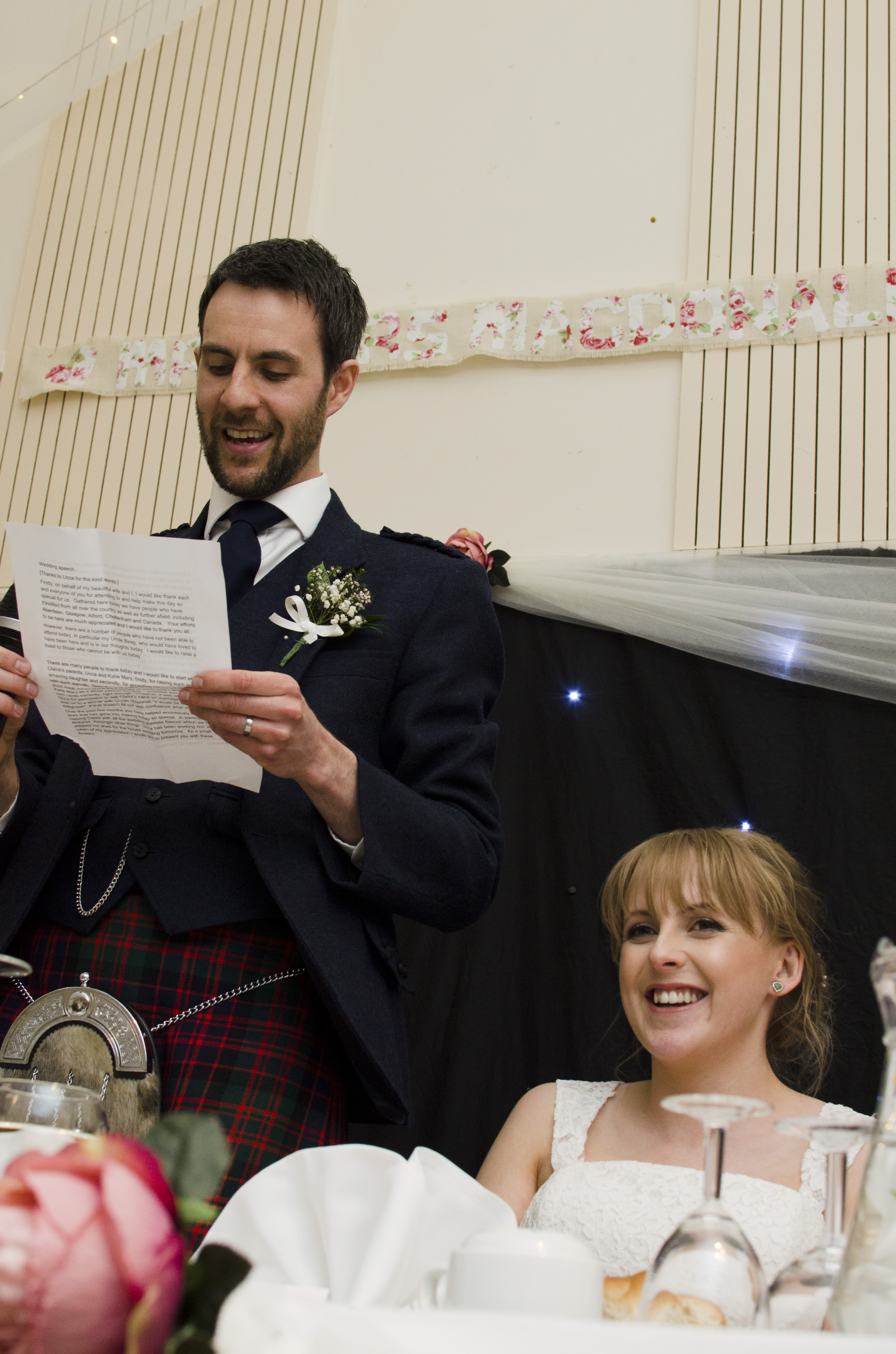 Kelly’s Grandad loves his harmonica also known as his ‘Moothie’ so he played a brilliant tune for the happy couple as they were being seated for their meal and speeches. Kelly’s Dad Stephen’s speech was beautiful and very heartfelt, obviously Kelly means a lot to him being his daughter and the wedding had more special meaning to Stephen and Lynne (Kelly’s parents) as they are from Banff, so they were extremely happy that the wedding was taking place there.