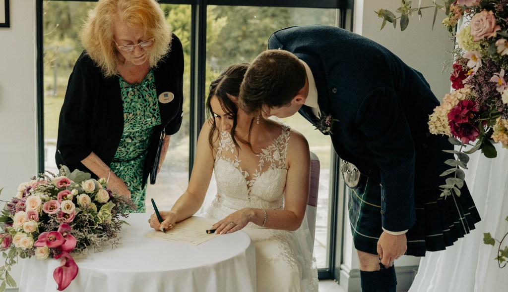 Tea, Cake & Signing the Register in Elphin Tearooms Afterwards, soaked to the absolute skin and full of joy, we all made our way to the Elphin Tearooms, a little Highland gem which was basked in the Sunshine not longer after we got there. Over slices of lovely cake and pots of tea, Meg and Sam signed the register. I had the honour of being one of their witnesses, alongside Nicky, something I am always honoured to do for couples.