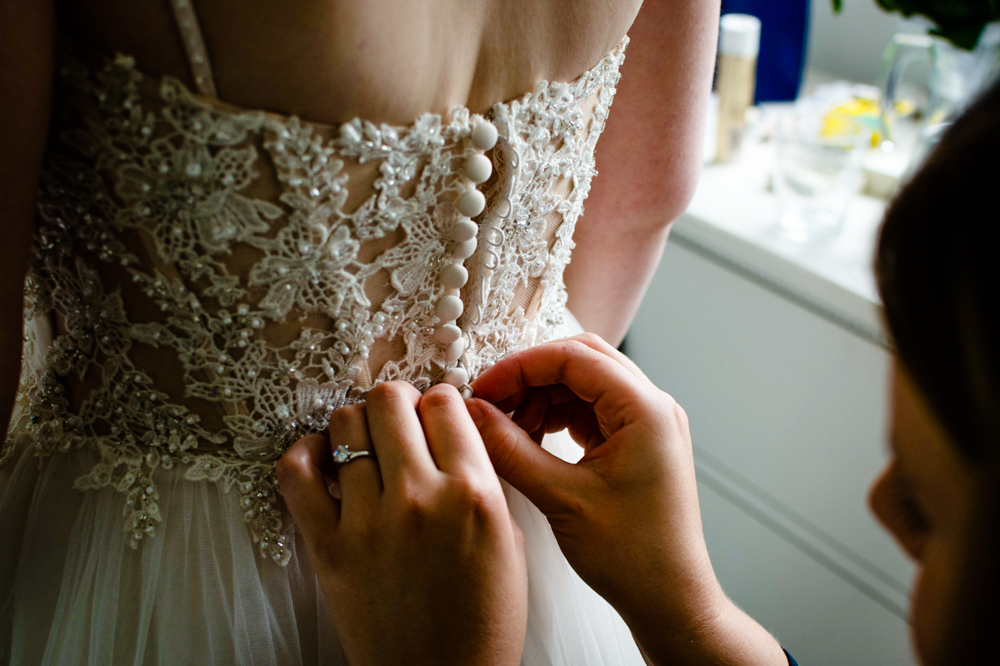 “Zoe wore a Gaia Bridal dress which she got from a bridal boutique near home. She wanted a long dress with some lace and loved the open back on this dress. She didn’t want anything sparkly or too glitzy with it being an outdoor, DIY wedding but wanted to feel her best. If you can’t wear a big, white dress on your wedding day, when else can you? It was very difficult to dance in, but Zoe was determined to get the wear out of it!”