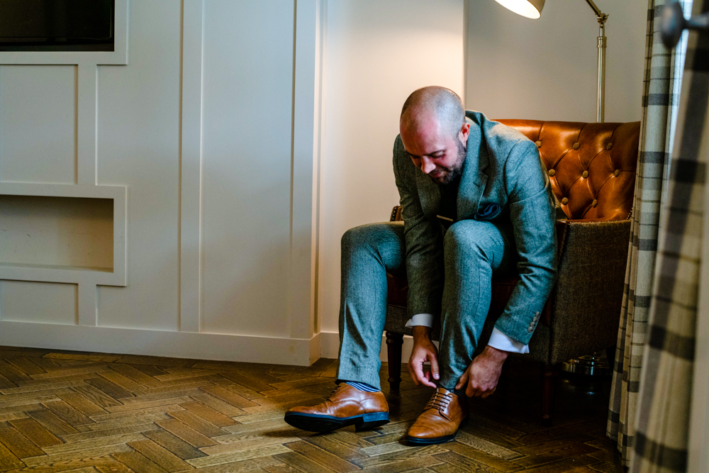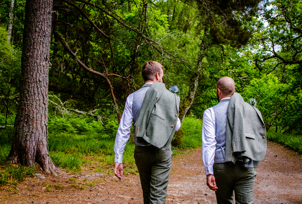 “Glenn and the groomsmen went for kilts, even though none of them are Scottish. Glenn wanted to wear a kilt because of where the wedding was being held. Glenn had wanted to wear a Northumbrian tartan but Zoe vetoed that idea because she thought it looked grey from a distance. We chose a Western Isles tartan because it matched the colour scheme and Glenn’s family names didn’t have any tartans! During the wedding, Glenn appreciated how practical and comfortable the kilt is, repurposing the sporran as a drink’s holder.”